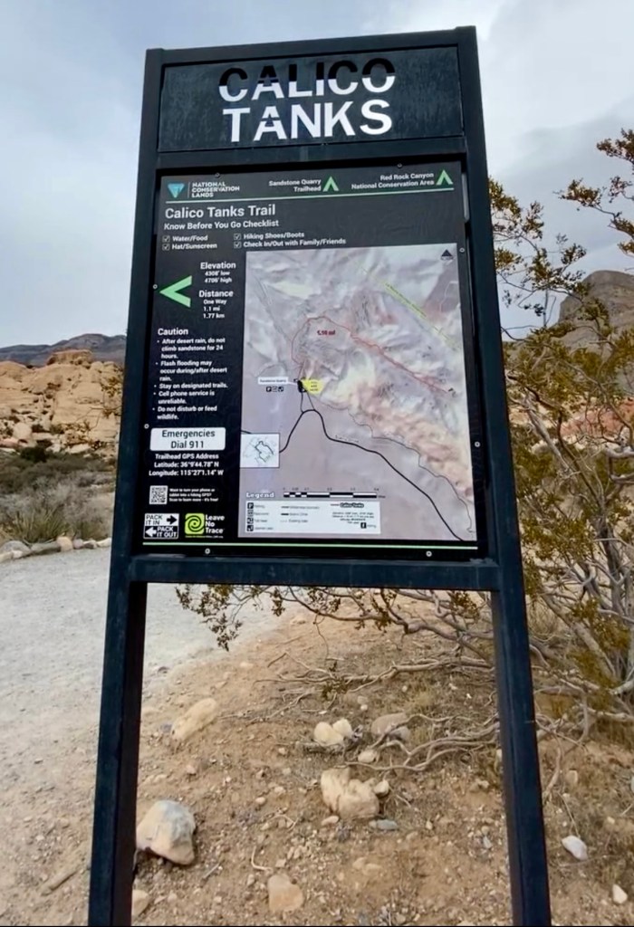 Along the drive there are 26 different hikes and trails. We’ve included a map of the loop above. After reading up on a few ahead of time, we selected the Calico Tanks trail. (Side note, we LOVE All Trails for researching different hikes and reading reviews on them. It’s our go to website when picking out hikes. Here’s the link to the Calico Tanks trail on All Trails https://www.alltrails.com/trail/us/nevada/calico-tanks-trail) Its about a two and a half mile out and back trail with a moderate to strenuous difficulty level and a decent elevation gain.
